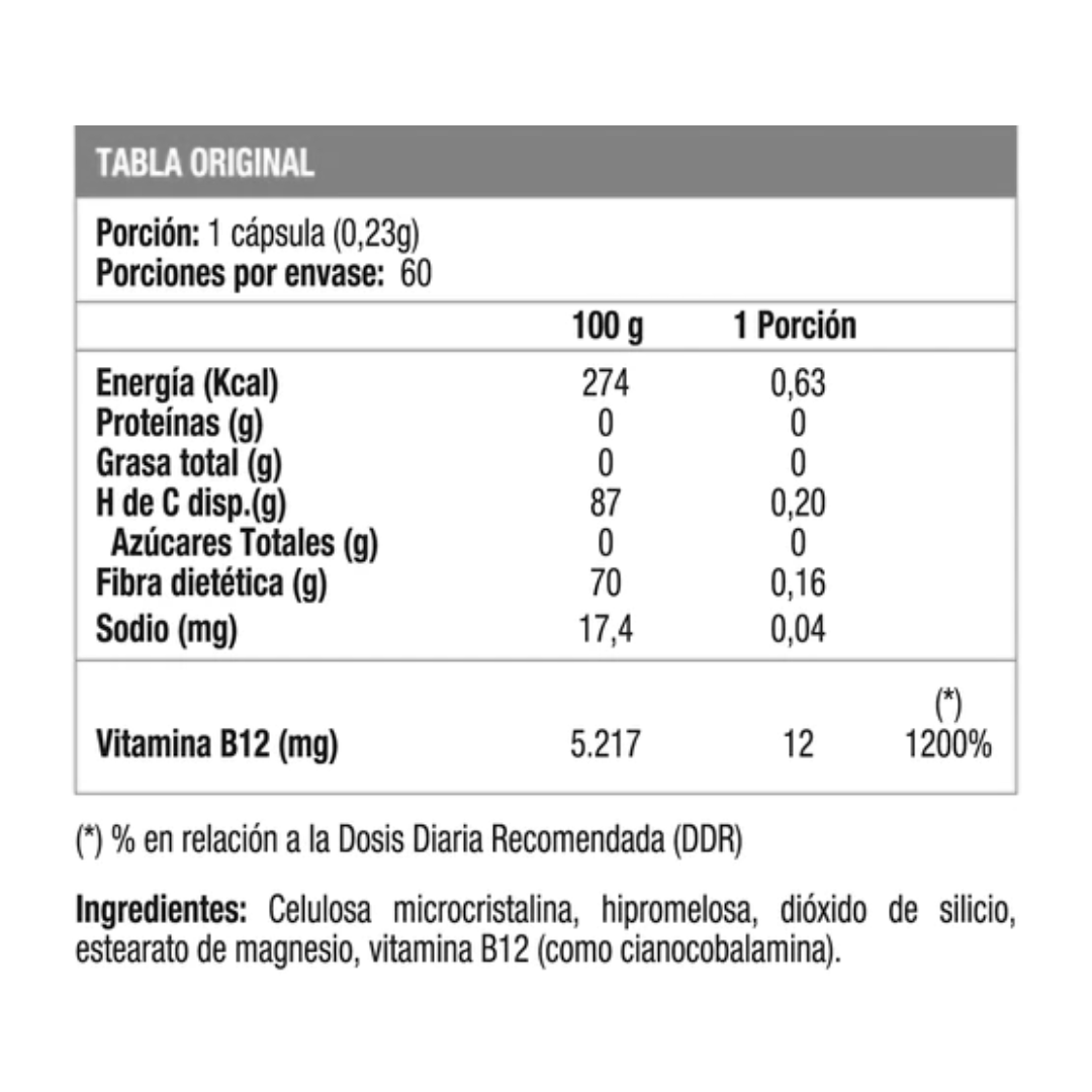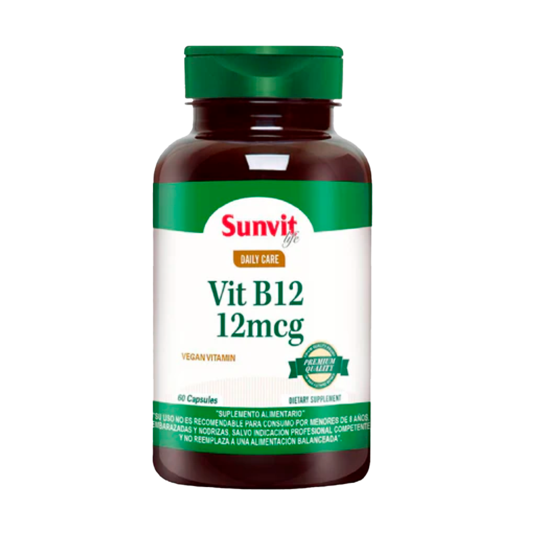 Vitamin B12de Sunvit Life, aporta 12 microgramos de vitamina B12 por porción. Ayuda a reducir riesgo de anemia y es esencial para el sistema neurológico.
